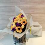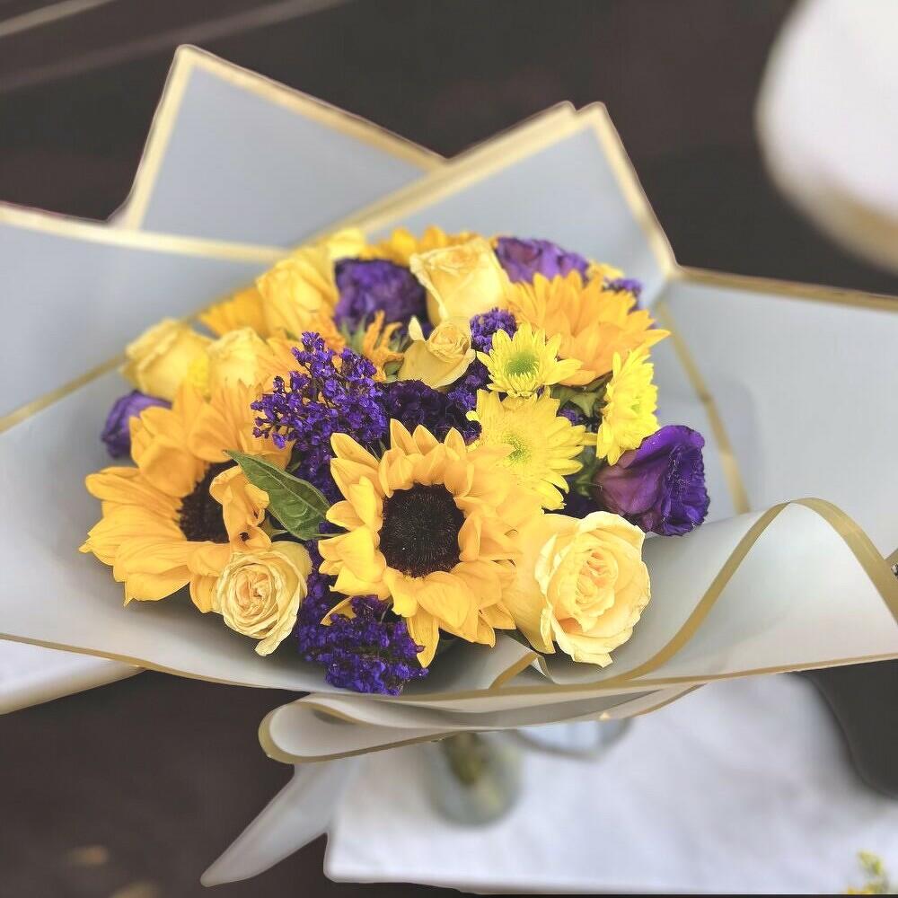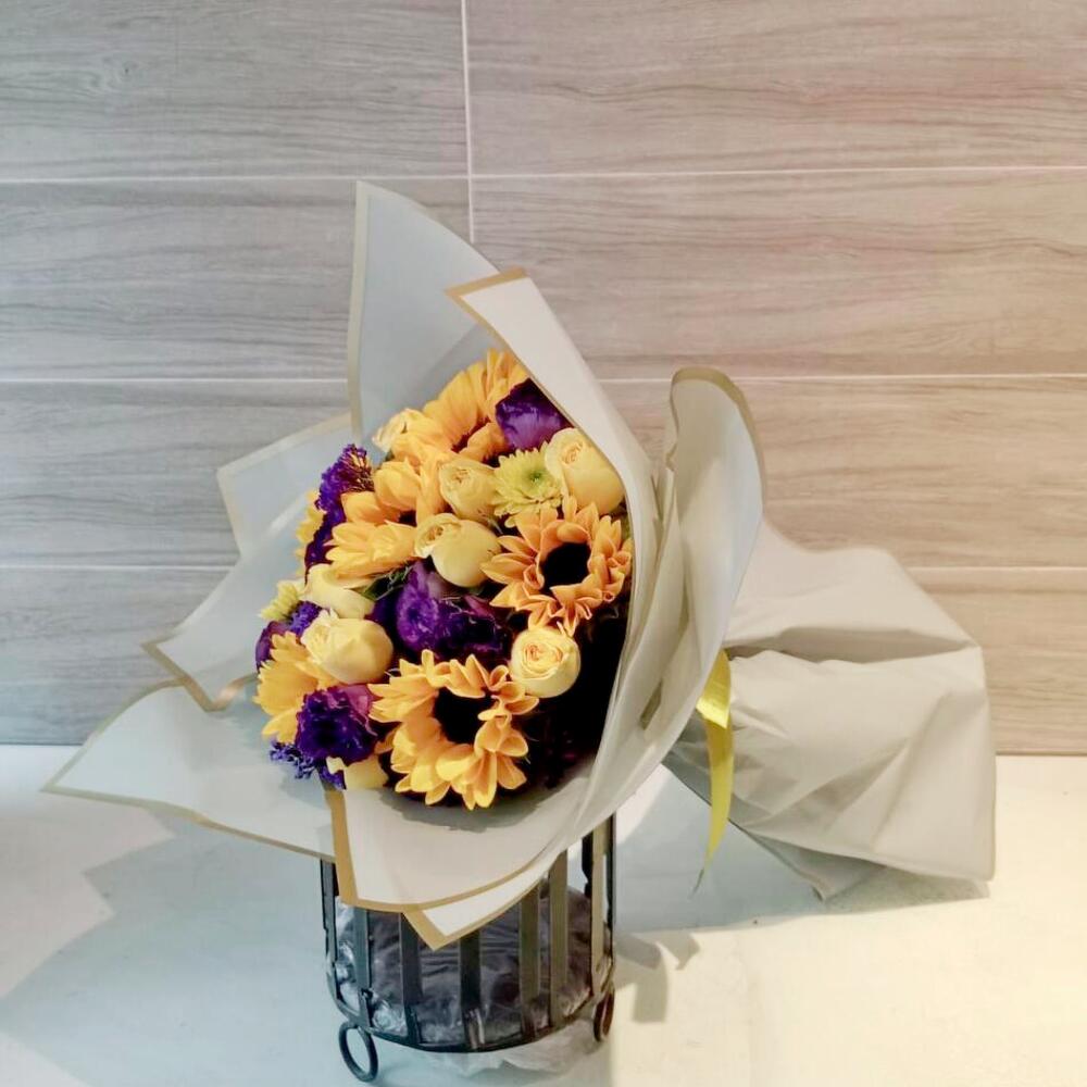Un ramo lleno de luz y alegría, que combina los cálidos tonos amarillos y naranjas de los girasoles y rosas con la elegancia del morado intenso de los lisianthus. Este bouquet es ideal para expresar felicidad, gratitud y energía positiva. Su envoltura en tonos claros con detalles dorados le da un toque sofisticado, perfecto para sorprender en cualquier ocasión especial. Para mantener su frescura por más tiempo, coloca el ramo en un florero con agua limpia y fresca, renovándola cada dos días. Recorta los tallos en diagonal antes de sumergirlos y evita la exposición directa al sol o fuentes de calor.