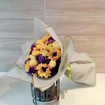 girasol - 5 шт. жовта троянда - 10 шт. лізіантус фіолетовий - 6 шт. жовта хризантема - 7 шт. moño - 1 шт. декоративний папір - 4 шт.