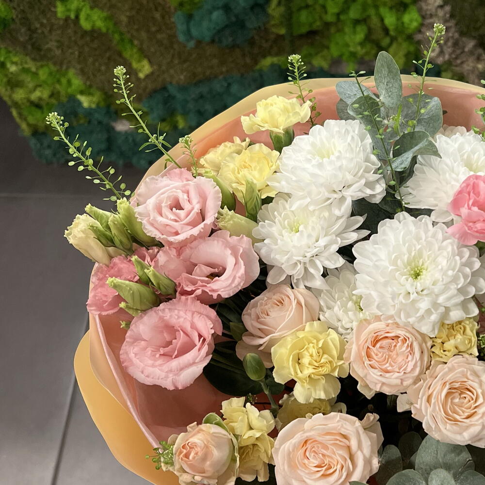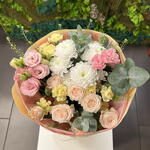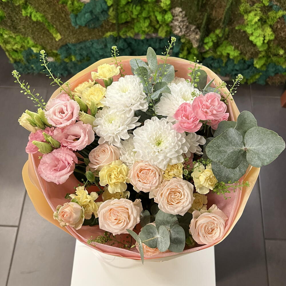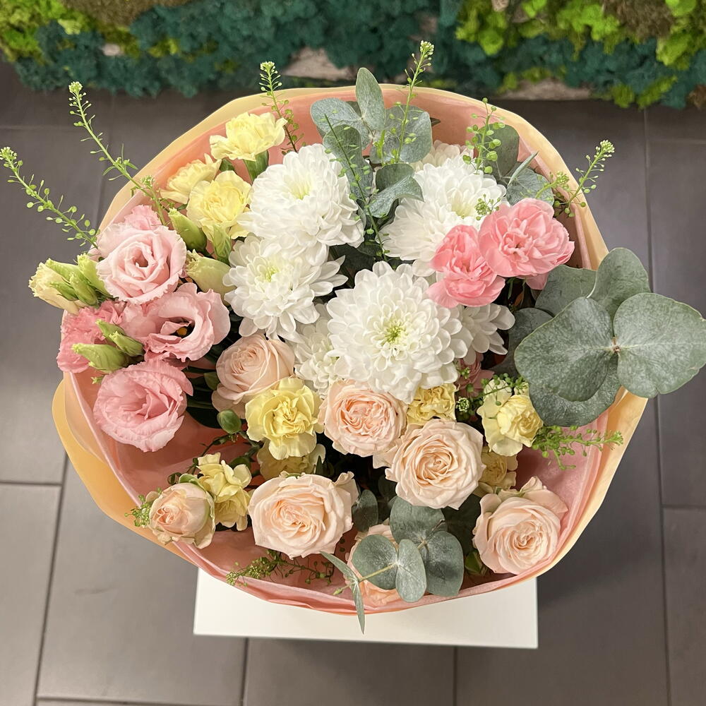 Chrysanthemum - 1 шт. bombastic spray rose - 1 шт. eukaliptus - 3 шт. dodatki zelione - 3 шт. papier de soie - 3 шт. litiantus - 1 шт. papier florystyczny - 2 шт. goździk gólązkowy - 4 шт.