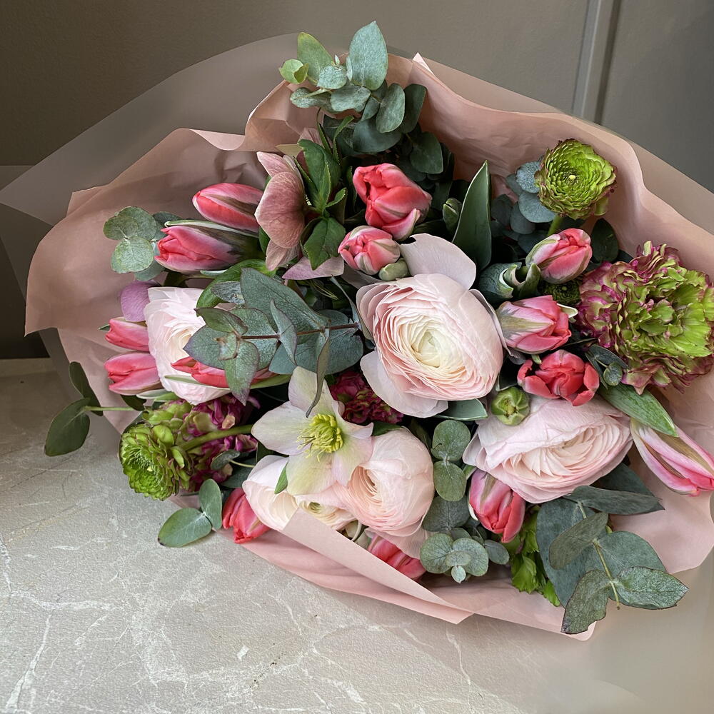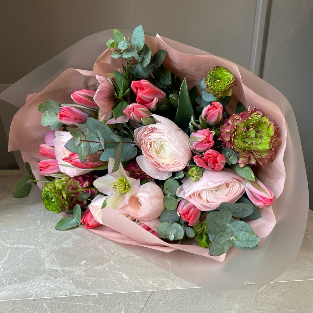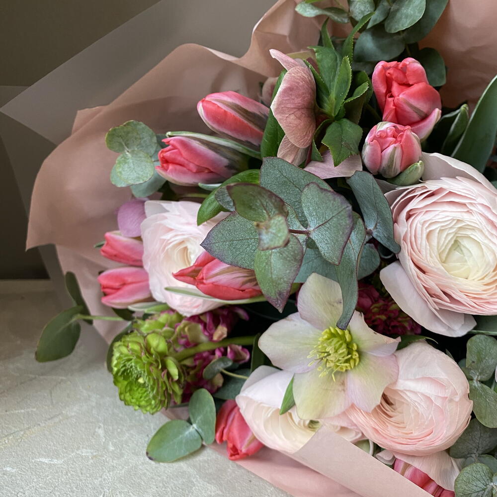 Eucalyptus - 6 шт. Tulips - 15 шт. ranunculus - 7 шт.