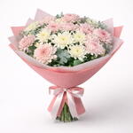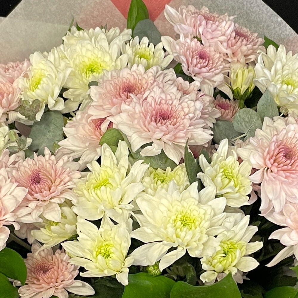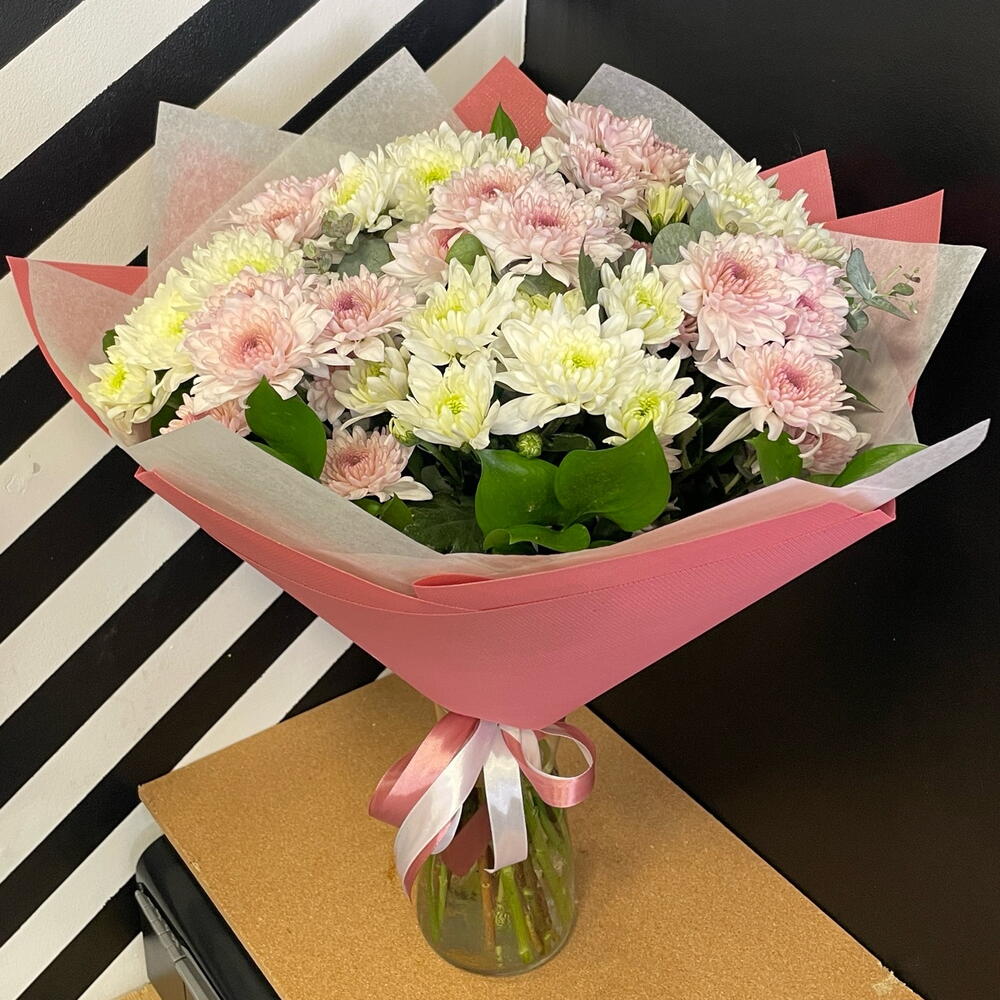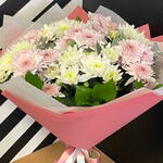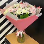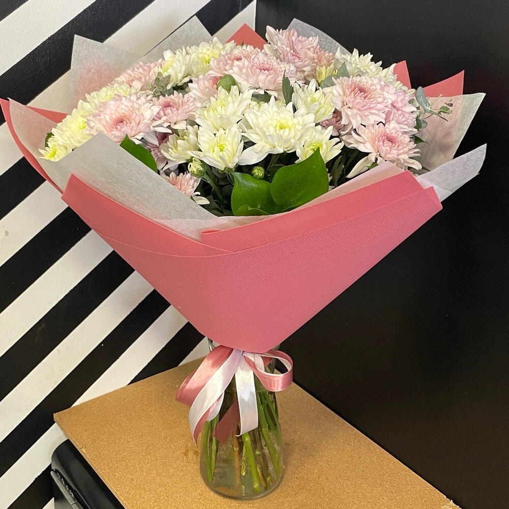 Ribbon - 1 шт. Eucalyptus - 1 шт. paper - 4 шт. chrisantema - 9 шт.