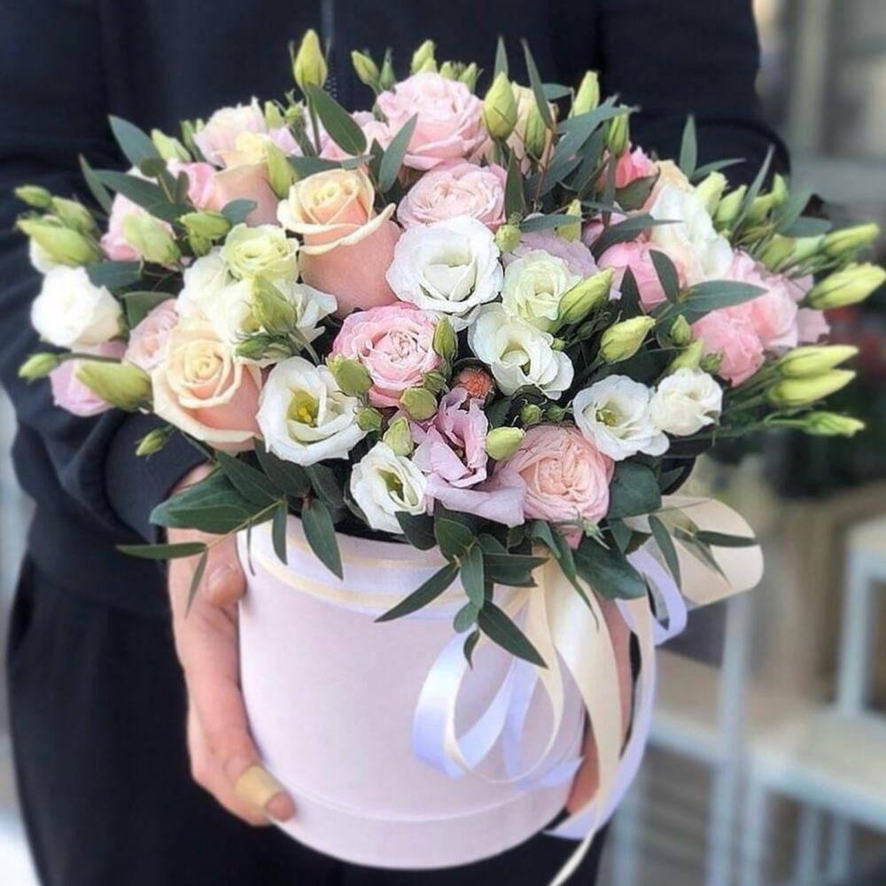 Гарна квіткова коробка з елементами евкаліпта, лізіантуса, гілочкової троянди та чайної троянди.