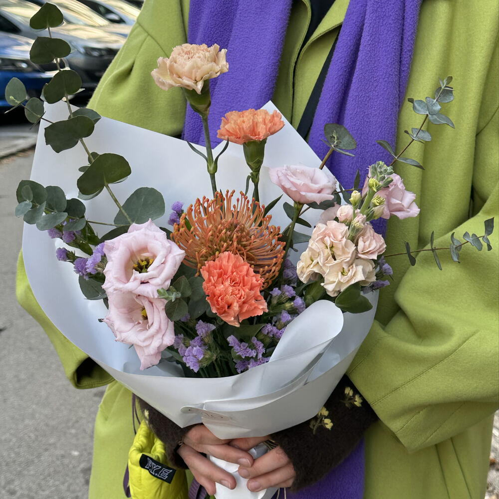 Statice - 2 шт. Eustoma - 2 шт. carnation - 3 шт. mathiola - 1 шт. новий - 1 шт. euvcaliptus - 2 шт.