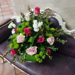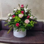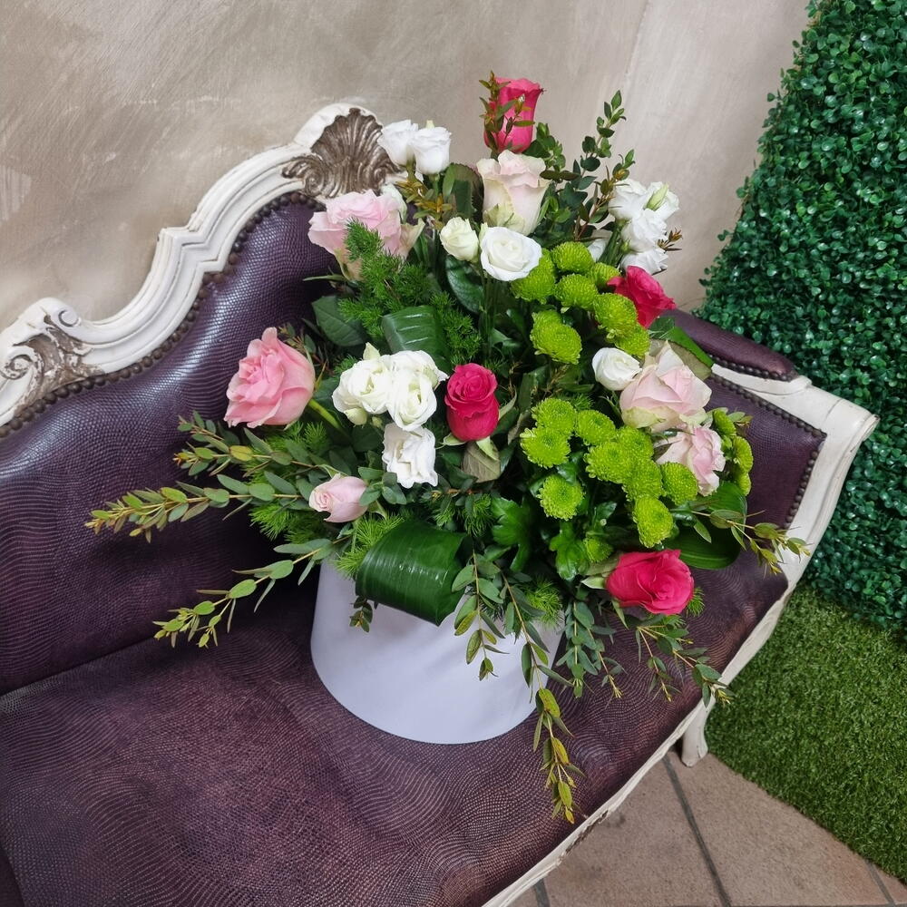 Flower box multicolor con lisiantus bianco,Santino verde ,Rose fuxia rose cipria verde di complemento e foglie aspidistra