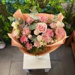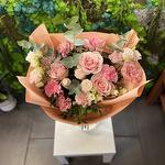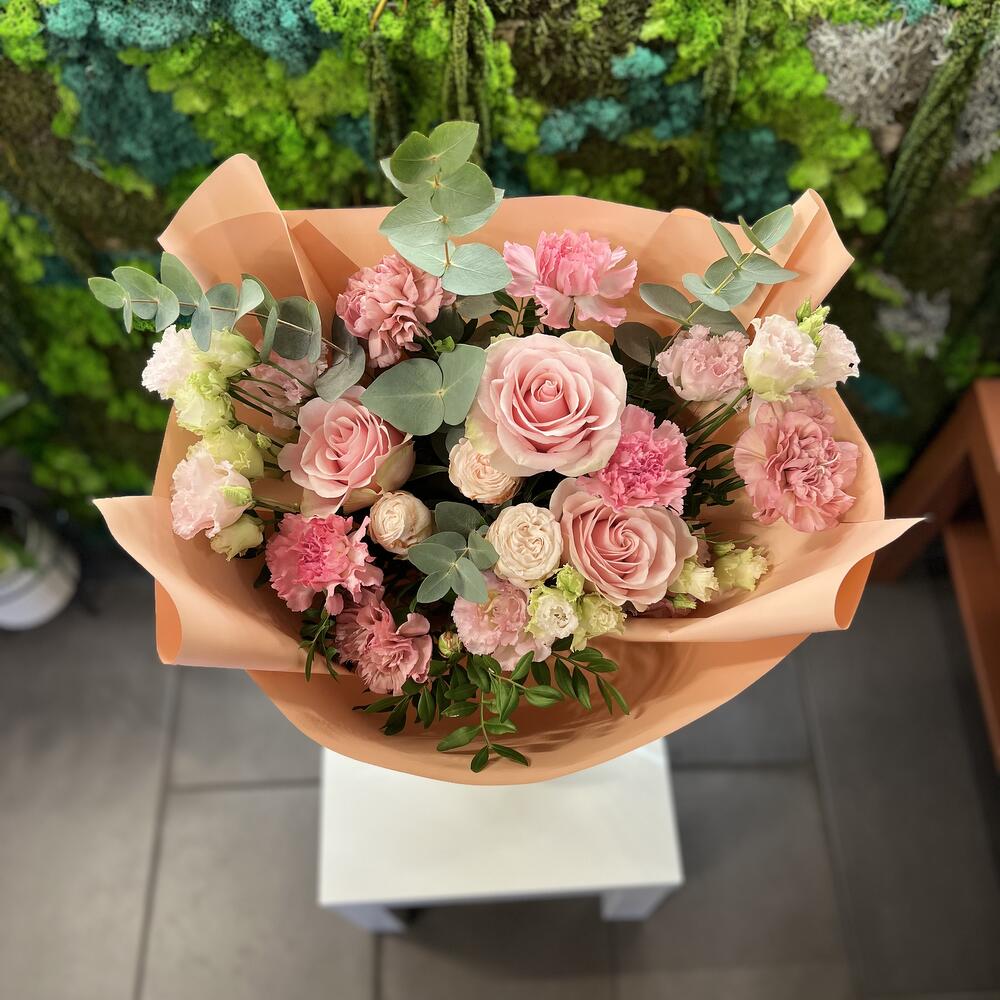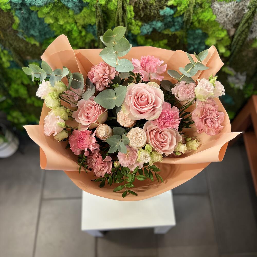 Eustoma - 2 шт. dianthus - 5 шт. eukaliptus - 4 шт. róża gałązkowa - 1 шт. różą frutteto - 3 шт.