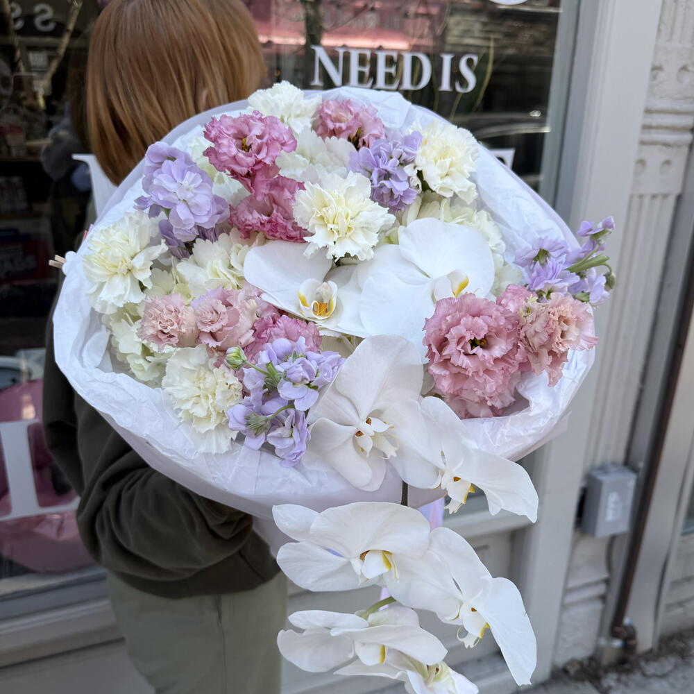 A soft, romantic composition that feels like a quiet spring morning in bloom. Blush Orchid Whisper features elegant cascading white phalaenopsis orchids paired with airy clouds of pastel carnations and delicate stock in shades of blush pink, lavender, and creamy white. The gentle textures and subtle color palette create a light, feminine look with a modern, graceful silhouette. Perfect for moments that call for understated beauty, tenderness, and effortless elegance.