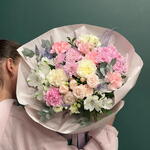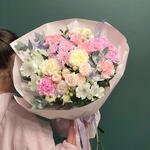 Chrysanthemum - 2 шт. Alstroemeria - 2 шт. dianthus - 5 шт. eukaliptus - 3 шт. róża gałązkowa - 1 шт. róża biała - 1 шт. papier dekoracyjny - 4 шт. wstążka - 2 шт. lithiantus - 1 шт. ostnica - 4 шт.