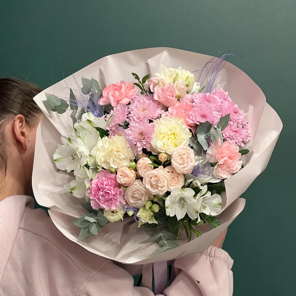 Chrysanthemum - 2 шт. Alstroemeria - 2 шт. dianthus - 5 шт. eukaliptus - 3 шт. róża gałązkowa - 1 шт. róża biała - 1 шт. papier dekoracyjny - 4 шт. wstążka - 2 шт. lithiantus - 1 шт. ostnica - 4 шт.