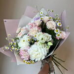 Eustoma - 1 шт. alstromerijos - 3 шт. gvazdikai - 4 шт. smulkiažiedės rožės - 3 шт. popierius - 4 шт. ramūnių šakelės - 3 шт.