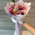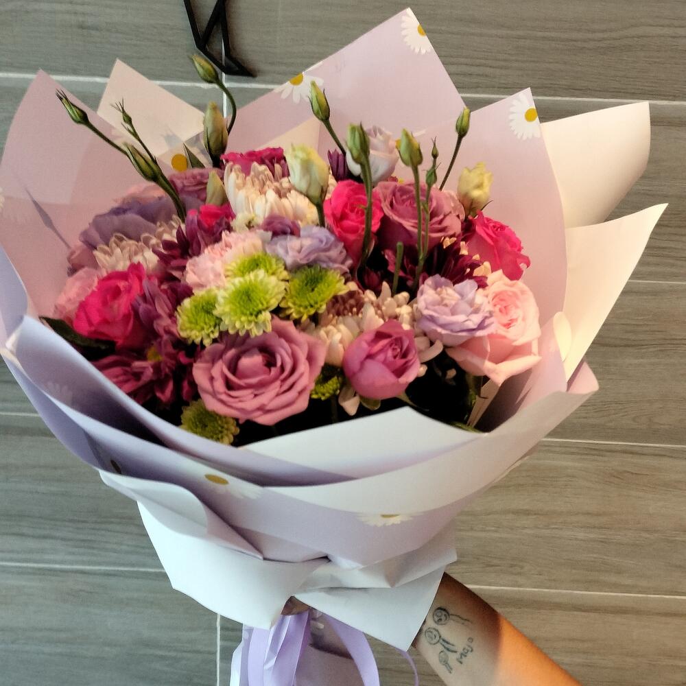 білі маргаритки - 10 шт. рожеві троянди - 5 шт. рози фуксія - 5 шт. лілові троянди - 5 шт. margaritas uva - 10 шт. yokos - 5 шт. papel tissut - 5 шт.