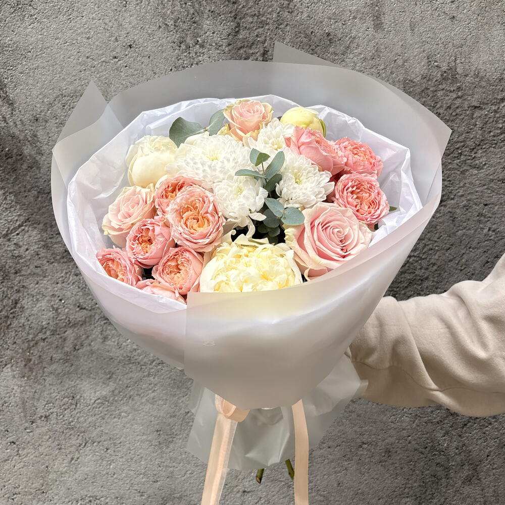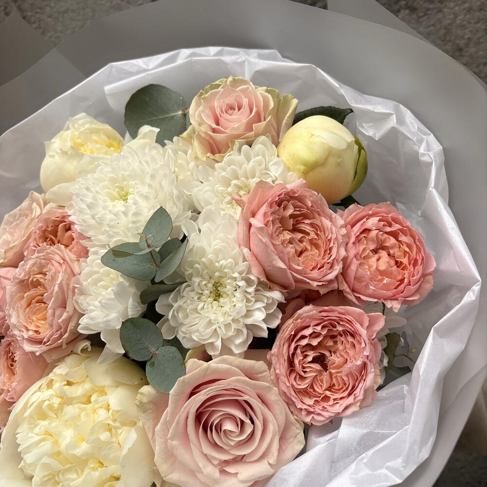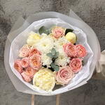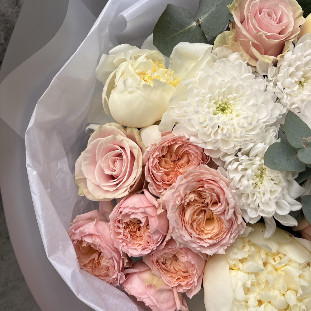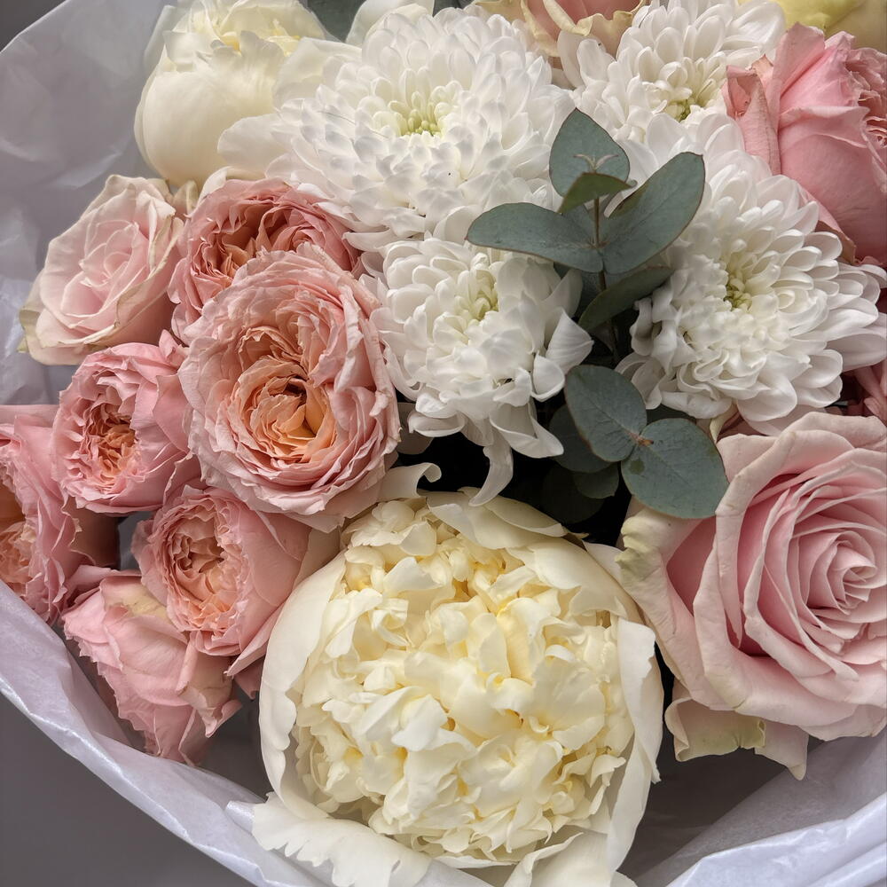Ribbon - 1 шт. Spray rose - 2 шт. Peony - 3 шт. rose - 3 шт. packaging - 3 шт. evcaliuptos - 2 шт.