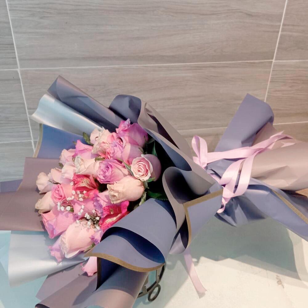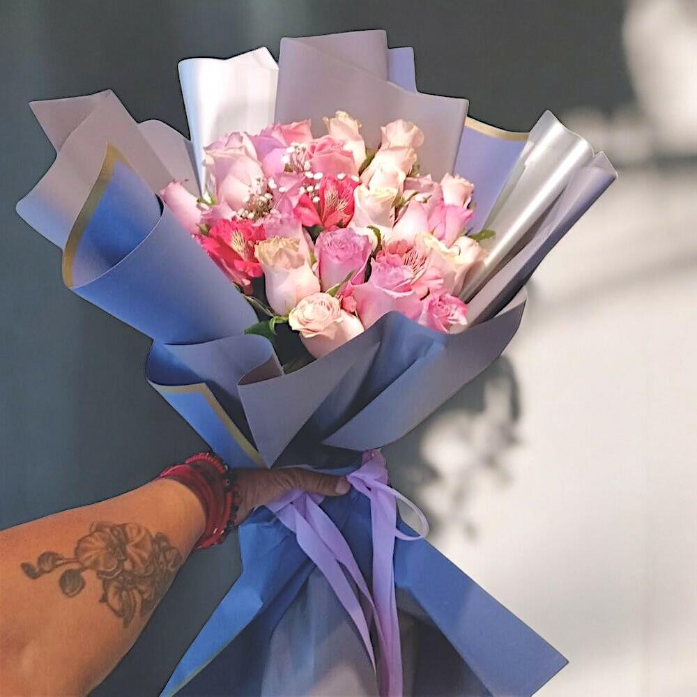 Este hermoso ramo en tonos rosados es la perfecta expresión de dulzura y elegancia. Con una combinación de rosas en distintos matices, alstroemerias vibrantes y toques delicados de gypsophila, transmite sentimientos de amor y admiración. Su envoltura en tonos azul pastel con detalles dorados aporta un toque de sofisticación y encanto. Perfecto para cumpleaños, aniversarios o simplemente para alegrar el día de alguien especial. Para mantener su frescura, coloca las flores en un florero con agua limpia y fresca. Recorta los tallos en diagonal cada dos días para mejorar la absorción y cambia el agua regularmente. Evita la exposición directa al sol y las corrientes de aire para prolongar su belleza.