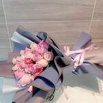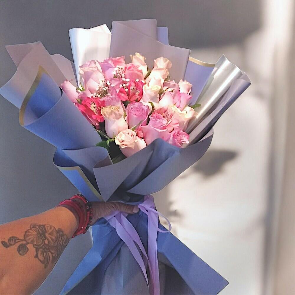 alstroemeria rosa - 3 шт. рожеві троянди - 10 шт. пастельні рожеві троянди - 10 шт. moño - 1 шт. декоративний папір - 3 шт. біла гіпсофіла - 4 шт.