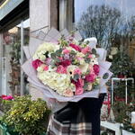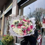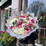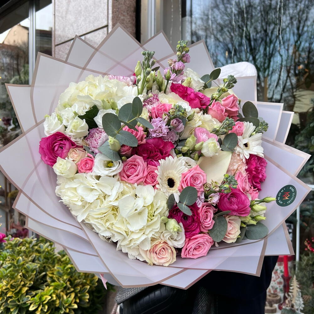 Eucalyptus - 9 шт. Lisianthus - 7 шт. rose pink mondial ecuador - 5 шт. calle white - 3 шт. гортензія - 3 шт. violaciocca - 7 шт. rose ramificate - 7 шт.