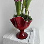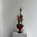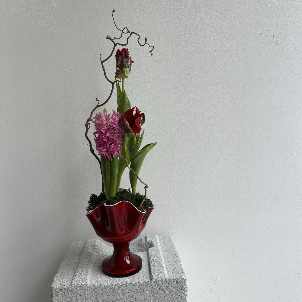 A floral arrangement of bulb flowers in a vintage plate. It requires minimal care — just occasional watering to keep it fresh and beautiful. The flowers will bloom gradually, creating an evolving and charming display.